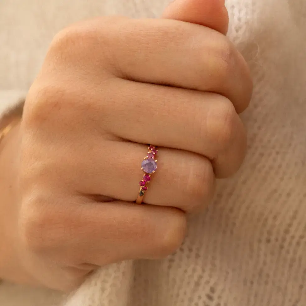 Elle peut en effet être sertie de plusieurs petites pierres colorées, via un seul anneau ou encore sous la forme d'une bague trilogie.