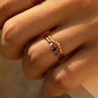 Un stack précieux associe des bagues diamant et des bagues serties de pierres fines pour apporter lumière et contraste. La superposition de bagues fines avec pierres précieuses colorées permet de créer un ensemble plus sophistiqué, tout en conservant une lecture fluide.